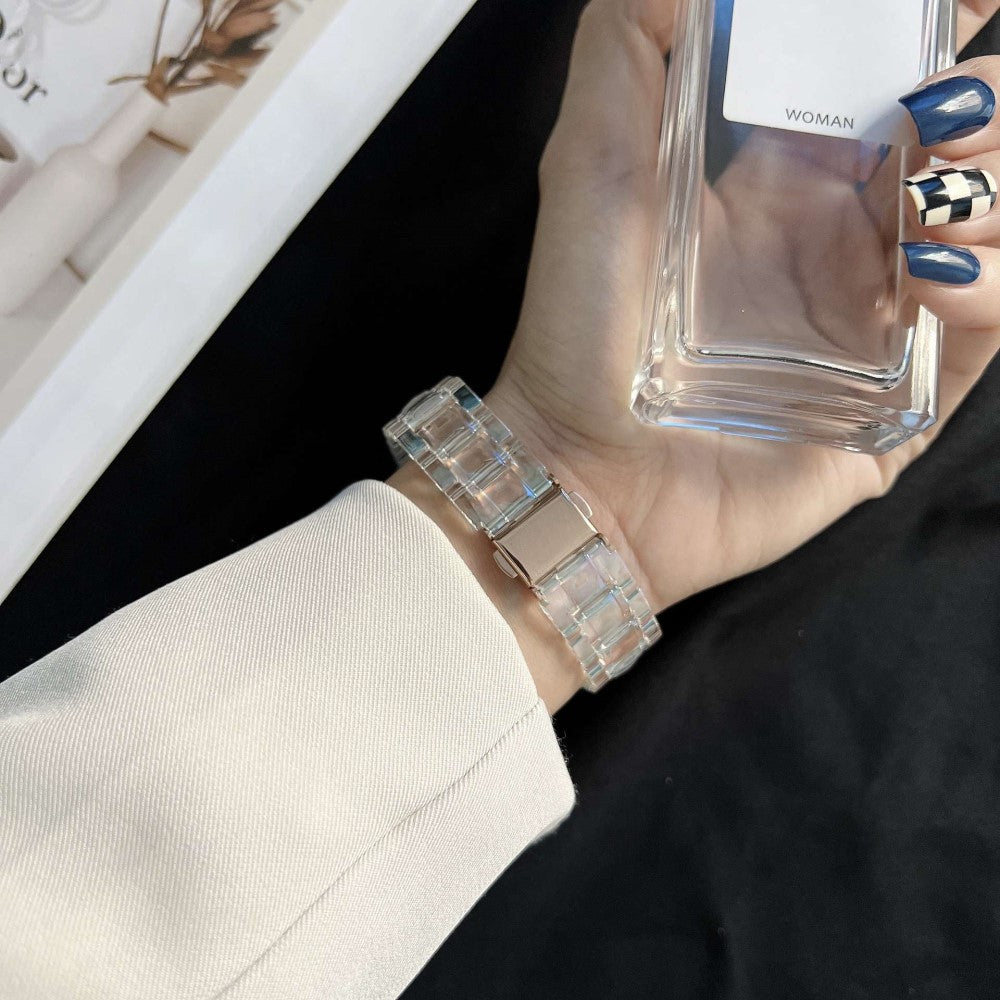Mit diesem exquisiten Ersatzarmband, das für eine Reihe von Modellen wie die Apple Watch Ultra, Series 8, 7, 6, 5, 4, SE und mehr geeignet ist, kannst du deine Apple Watch aufwerten. Das aus hochwertigem Acryl gefertigte Armband ist wasser- und schmutzabweisend und garantiert Langlebigkeit und Widerstandsfähigkeit beim täglichen Tragen. Die Galvanotechnik verleiht ihm ein strahlendes, metallisches Finish, das dein Zifferblatt wunderbar ergänzt und es zu einer auffälligen Ergänzung für jedes Outfit macht.Komfürt steht bei diesem Design an erster Stelle, denn es liegt weich und sicher am Handgelenk an, sodass du es den ganzen Tag tragen kannst. Die Faltschnalle aus Metall garantiert nicht nur Sicherheit, sondern auch müheloses Tragen, sodass du die Uhr mühelos an- und ablegen kannst. Dieses Armband eignet sich perfekt für alle, die ein altes oder beschädigtes Armband auffrischen möchten. Es lässt sich in verschiedenen Größen und Stilen ganz nach deinem persönlichen Geschmack gestalten. Erhalte ein modisches Upgrade und genieße die perfekte Mischung aus Funktionalität und Stil.