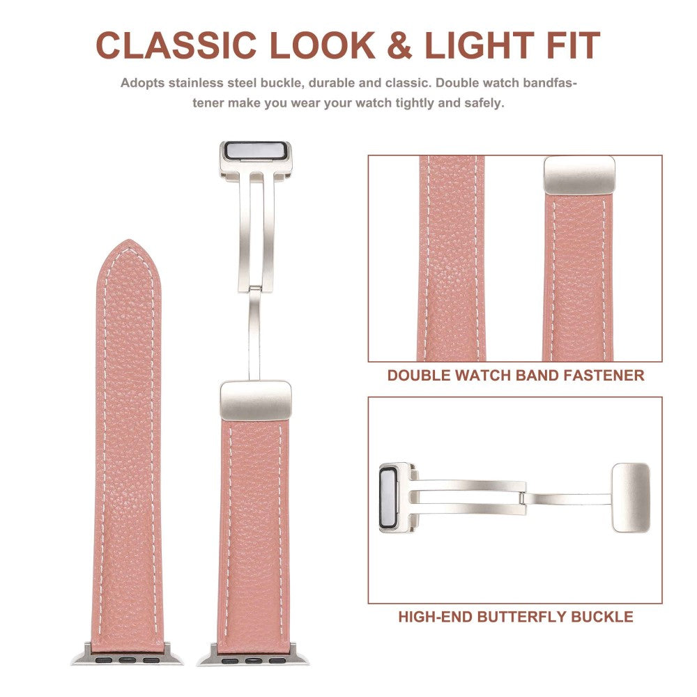 Für Apple Watch Ultra 49mm / Series 7 / 8 45mm / SE / SE (2022) / 6 / 5 / 4 44mm 3 / 2 / 1 42mm Texturiertes Armband aus echtem Leder mit Schnellverschluss und Faltschließe - Deep Pink Hergestellt aus hochwertigem echtem Leder, angenehm zu tragen und leicht mit deinem täglichen Outfit zu kombinieren Das Material ist unbedenklich für die menschliche Haut und nicht allergisch,und die Schließe ist aus hochwertigem, langlebigem Material Hochwertige Faltschließe, mit der du das Armband ganz einfach an dein Handgelenk anpassen kannst Es gibt verschiedene Farben zur Auswahl, du kannst dein Lieblingsarmbandfür verschiedene Stilrichtungen wählen Ein idealer Ersatz für dein altes, kaputtes Armband.Geeignet für Arbeit, Freizeit oder andere tägliche Anlässe für Frauen/Männer Technische Daten Material:Echtes Leder Größe: 120mm+96mm Handgelenkumfang:160mm-220mm Kompatibel mit: Apple Watch Serie 1 42mm Apple Watch Serie 2 42mm Apple Watch Serie 3 42mm Apple Watch Serie 5 44mm Apple Watch Serie 4 44mm Paket enthalten: 1 x Armband Andere Artikel nicht enthalten