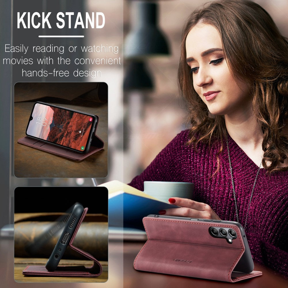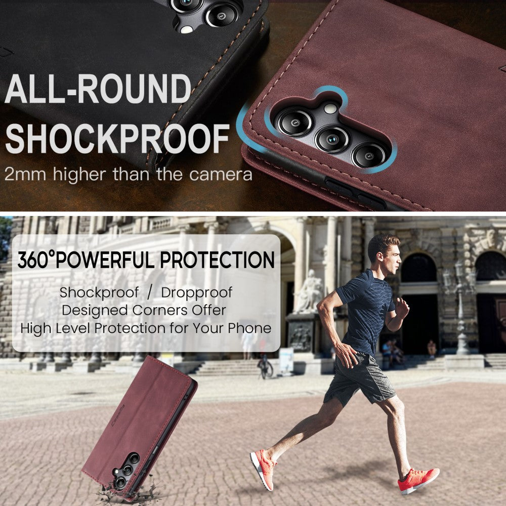 Die CaseMe Vintage Hülle besteht aus weichem Vintage-Kunstleder und enthält außerdem eine harte TPU-Schale, wodurch das Gehäuse noch langlebiger und stoßfester wird. Das Vintage Case für Samsung Galaxy A05s verfügt über 2 Kreditkartenfächer und einen zusätzlichen Steckplatz für Bargeld sowie einen klappbaren Ständer, der die Freisprechfunktion ermöglicht.