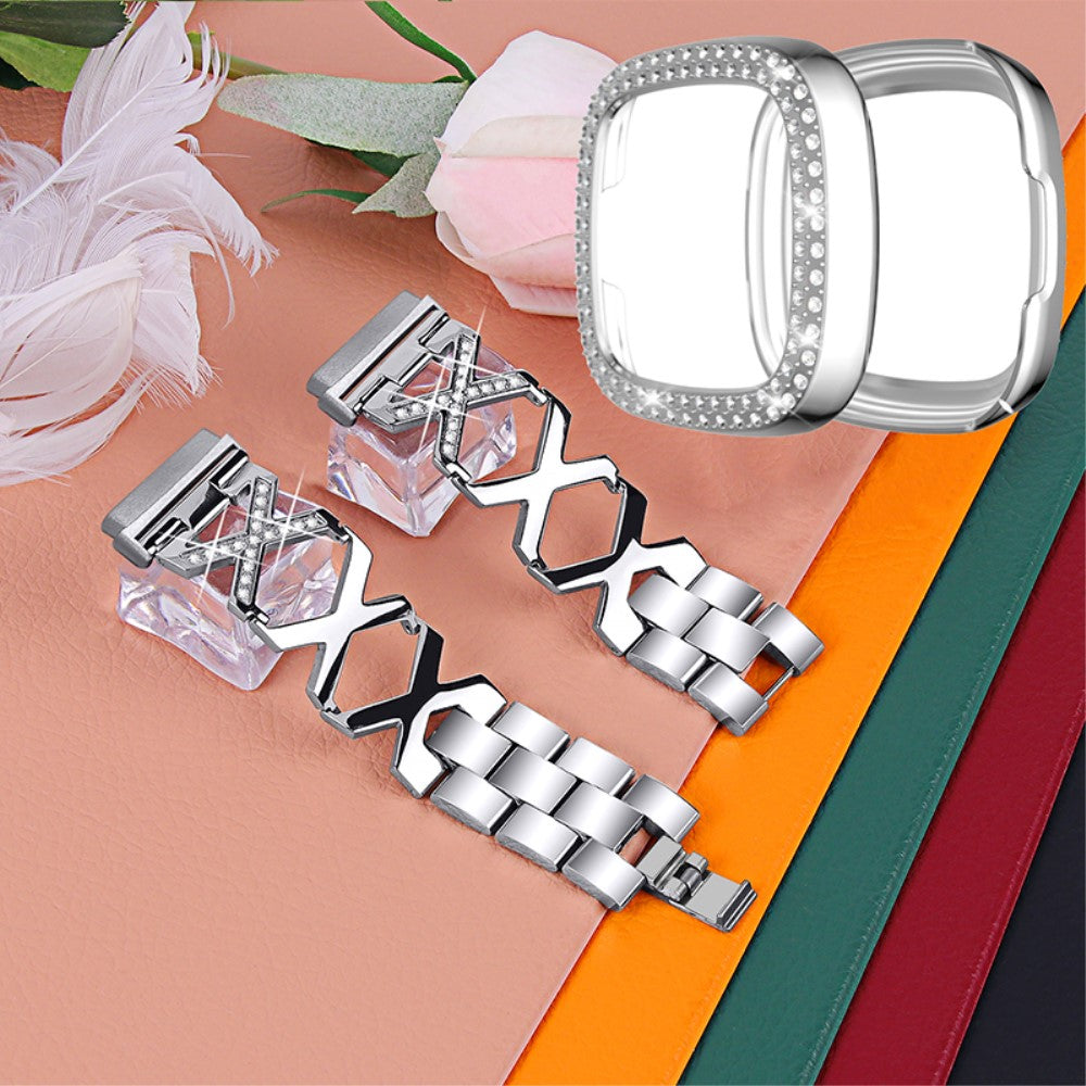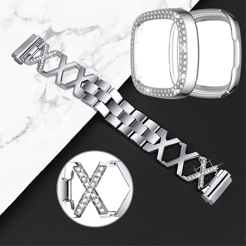 Für Fitbit Versa 3 / Sense Stylisches X-Shape Design Edelstahlarmband Armband + Zwei Reihen Strasssteine Silberne Uhrentasche - Silber Das Armband ist aus hochwertigem 304 Edelstahl gefertigt, stark und langlebig Das Metallarmband ist mit zarten und glänzenden Strasssteinen verziert, macht deine Smartwatch schöner und stilvoller Einzigartiges hohles X-Shape Design, elegant und exquisit Kommt mit einer silbernen Uhrentasche, die mehr Schutz bietet Die Uhrentasche ist mit zwei Reihen Strasssteinen gestaltet Spezifikationen: Material des Armbands:304 Edelstahl, Strasssteine Geeigneter handgelenkumfang:5,5-8,1 Zoll Kompatibel mit: Fitbit Sense Fitbit Versa 3 Paket enthalten: 1 x Armband 1 x Uhrentasche Uhr nicht im Lieferumfang enthalten